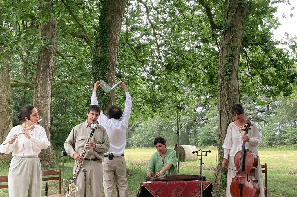 Librement inspirée de la Conférence des oiseaux de Farid-ud-Din ‘Attâr, écrite en 1177, chef-d’œuvre universel de la littérature persane, la nouvelle création de l’Ensemble Zellig réunit quatre musiciens et un comédien récitant pour un spectacle original. Les musiciens alternent improvisations, compositions collectives, réinterprétations d’œuvres classiques, Janequin, Schumann, Roussel, Stravinski, Messiaen… et se font eux-mêmes acteurs, investissant la scène, se déplaçant, donnant la réplique au récitant. Le tout illuminé du timbre pur et scintillant du santûr* iranien confié à la virtuose de l’instrument, Farnaz Modarresifar.