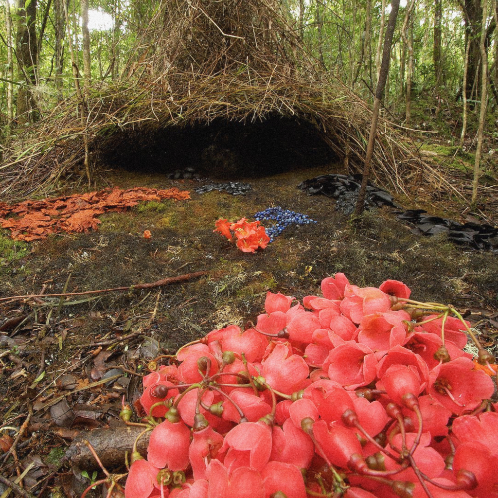 oiseau d’Australie qui décore son nid pour attirer les femelles